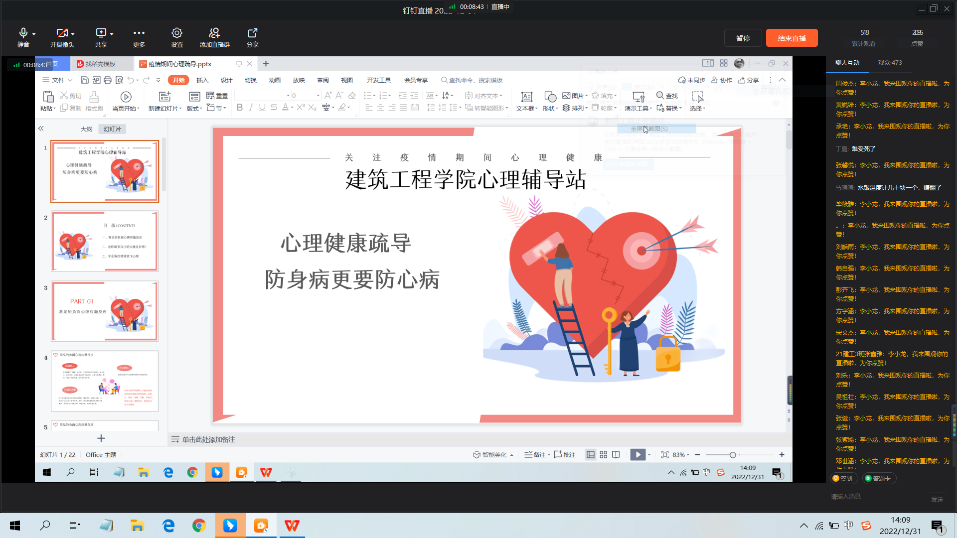 在新冠疫情防控的新形势下,为缓解学生面对奥密克戎来袭的心理压力,调适紧张和焦虑情绪,提高学生对因疫情而出现心理问题的应对技巧,12月31日下午,yl6809永利组织开展了线上心理疏导讲座,由yl6809永利心理老师李小龙担任主讲,21级和22级全体学生观看了此次讲座。