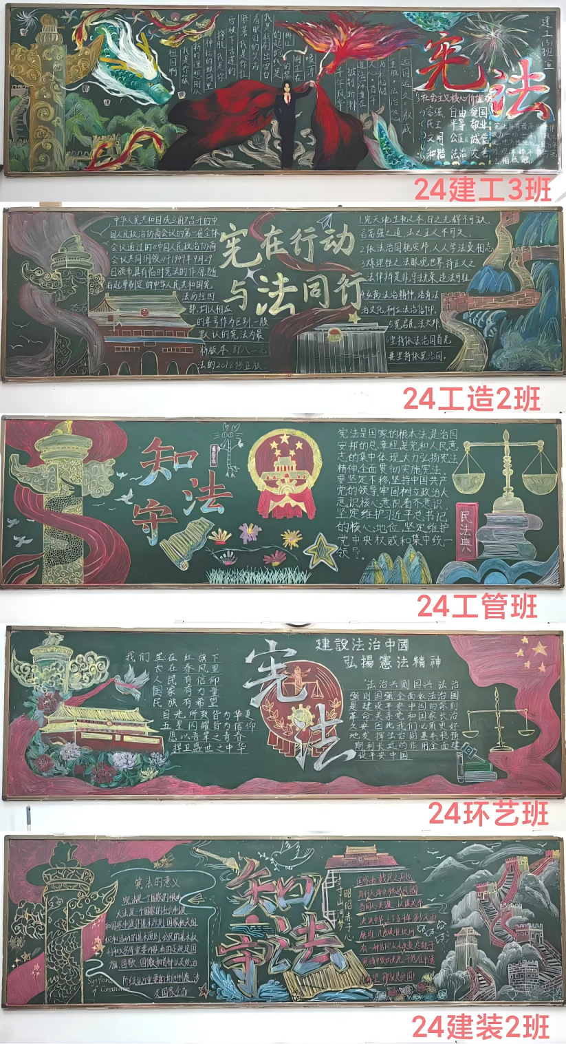 各在校班级积极参与,同学们充分发挥自己的创意和才华,以图文并茂的形式展示了宪法的基本内容、产生背景、发展历程以及宪法精神的重要性。还围绕宪法精神自主设计,结合自己的生活实际,创作出了一幅幅富有创意和感染力的黑板报作品,不仅充分展现了宪法的庄严与神圣,更激发了同学们学习宪法、尊重宪法的热情。经评选,24建工3班等6个班级分获一、二、三等奖。