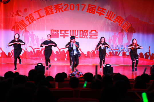 在校15、16级同学、墨轩书法社、街舞社、飞扬音乐社以及微光吉他社富有激情的表演,展示了正值花样年华的大学生的青春活力;14建工(1)班吴锐同学和杨靖、赵磊老师分别代表毕业生和学管老师的深情演唱;还有巢湖市文艺工作者友情演出的民乐小合奏,给大家演绎了中国的传统民族艺术;精彩的节目和现场互动交织在一起,赢得了现场观众阵阵热烈的掌声。9点50分演出全部结束,在场领导、老师与演职人员合影留念。