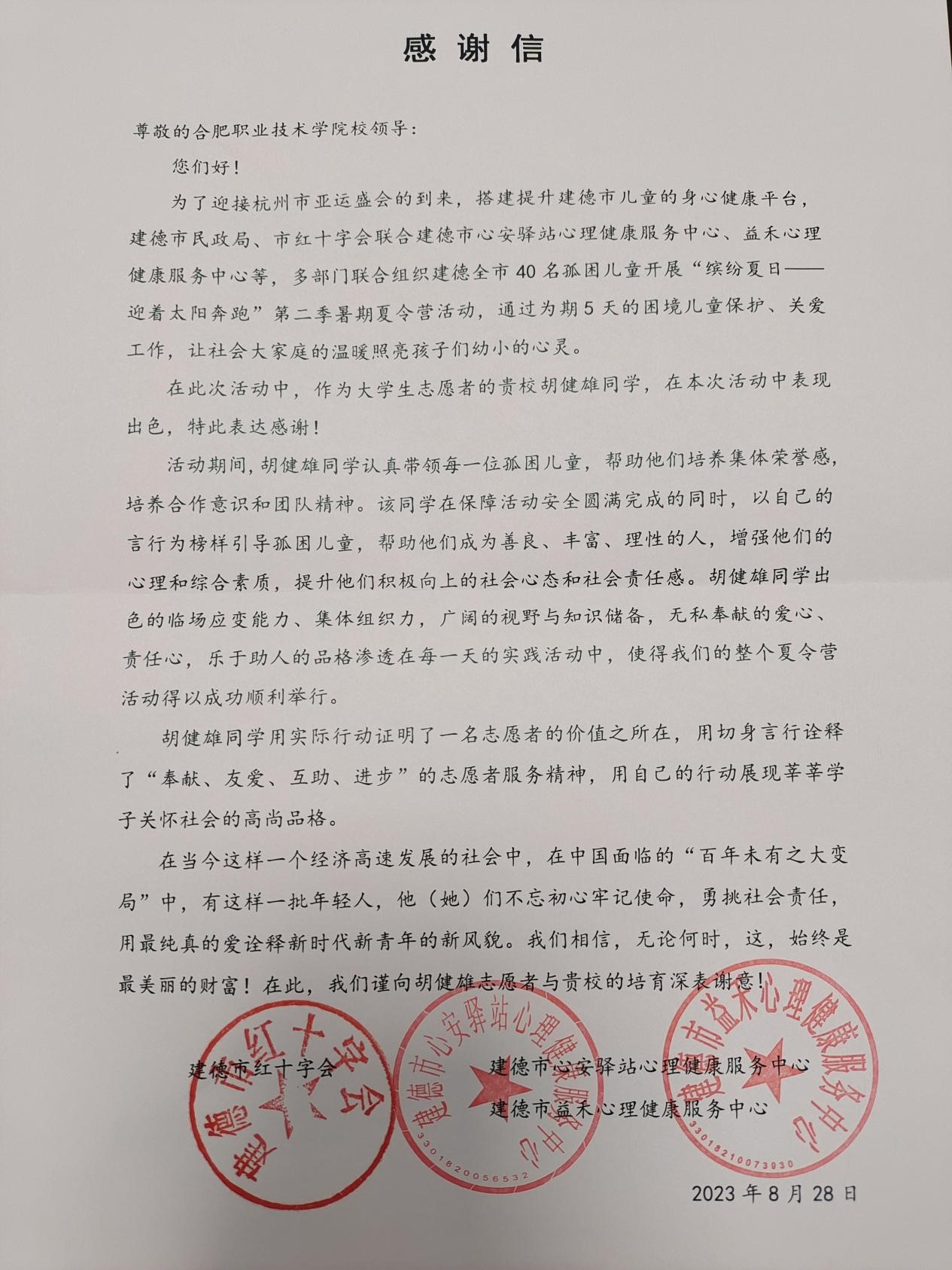 感谢信中写到,今年8月份,胡健雄同学参与建德市红十字会等多部门联合举行的孤困儿童第二季暑期夏令营活动。在为期5天的困境儿童保护、关爱工作期间,胡健雄同学工作认真积极,表现突出。在保障活动安全圆满完成的同时,以自己的言行为榜样引导孤困儿童,培养他们积极向上的心态和提升社会责任感。胡健雄同学出色的临场应变能力、组织能力,广阔的视野与知识储备,无私奉献的爱心、责任心,乐于助人的品格渗透在每一天的实践活动中,保证了整个夏令营活动的顺利举行。