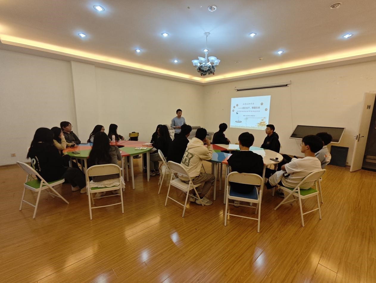 第二个环节是体验正念呼吸,李老师带领大家观察呼吸,感受一吸一呼的觉知。通过有意识地觉察眼下的一切而不带有任何评判,仅去温和地感知、与当下的体验和平共处,来达到情绪平和,身心合一。体验结束后,同学们分享自己的感受,纷纷表示感受到了身心的放松,思绪放空,内心的“原初的力量”被唤醒,有一种完完全全“活在当下”的感觉,更加热爱自己的生命,活动最后在舒缓平和的氛围中结束。