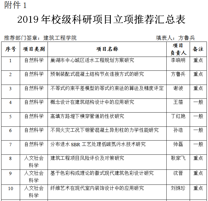 根据《永利集团yl6809关于开展2019年度校级科研项目申报工作的通知》(合职院教〔2018〕40号)文件精神,我院组织各教研室积极申报,截至目前共收到申报书10项(见附件1),将于2018年9月13日14:00—16:00在yl6809永利会议室208,拟对我院申报2019年度高校自然科学和人文社科研究项目组织专家(见附件2)评审。