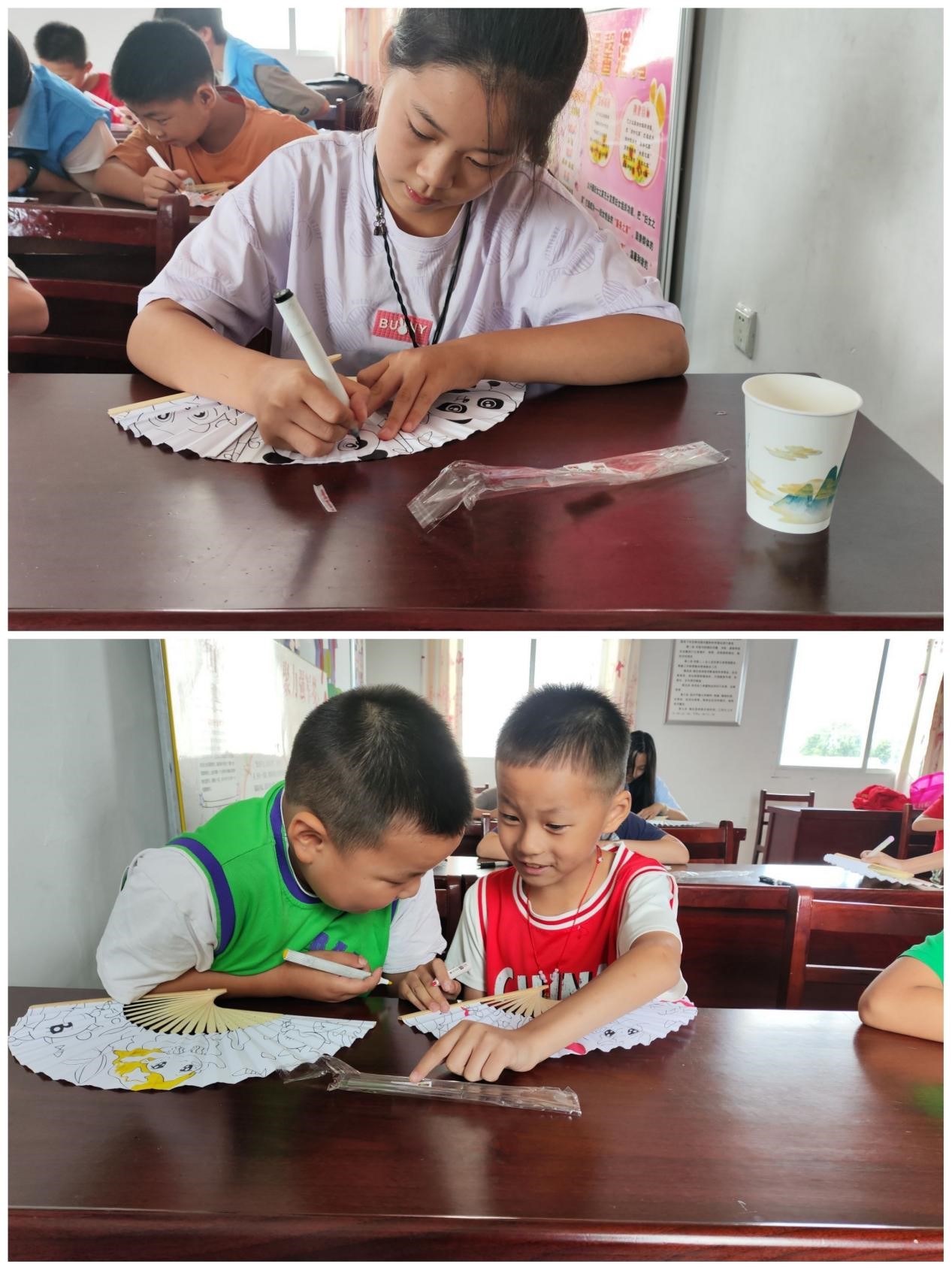 此外,为了让小朋友们更好的表达情绪,尽情的倾诉自己的烦恼与喜悦,同时激发他们的创造力,还开展了心理涂鸦活动。在团队成员的示范下,小朋友们在空白的纸扇上留下了各自的色彩,他们尽情发挥想象力,用画笔在纸上描绘出自己内心的情感世界。涂鸦结束后,队员们向小朋友们讲述如何控制自己的情绪,做情绪的主人。涂鸦活动不仅释放了小朋友们内心的情感,也增强了他们的自信心和表达能力。