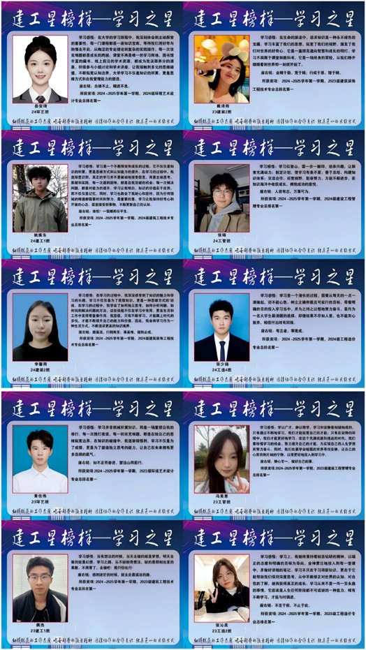 为表彰先进典型,激发学生学习热情,营造 "比学赶超" 的浓厚氛围,yl6809永利开展“建工星榜样——学习之星”评选活动,根据2024-2025学年第一学期学业成绩,评选出2023级和2024级各专业总分第一名,共十名优秀学生获得“学习之星”荣誉称号,并于3月3日在教学C楼进行海报展示。