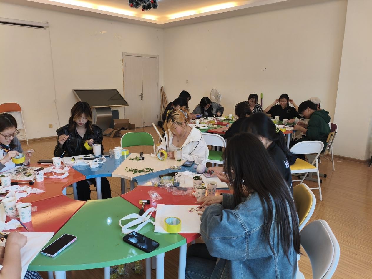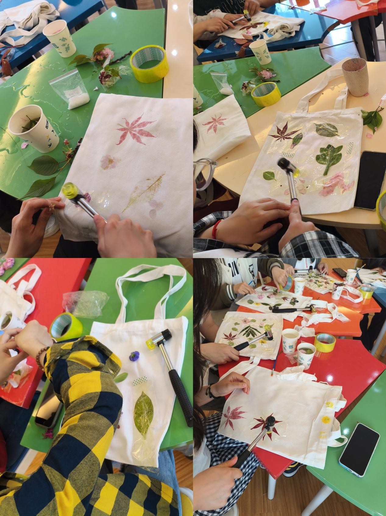 植物拓染不仅是一门传统技艺,更是一种心理疗愈方式。通过接触自然素材和创造性表达,学生能够暂时脱离学业焦虑,在专注与创造中实现情绪疏导。活动现场还设置了作品展示与互评环节,学生们互相交流创作灵感,传递积极情绪。学生们纷纷说道,“在拓染过程中,我好像把压力都‘敲’进了布里,看着植物汁液慢慢渗透成画,心情特别放松!”