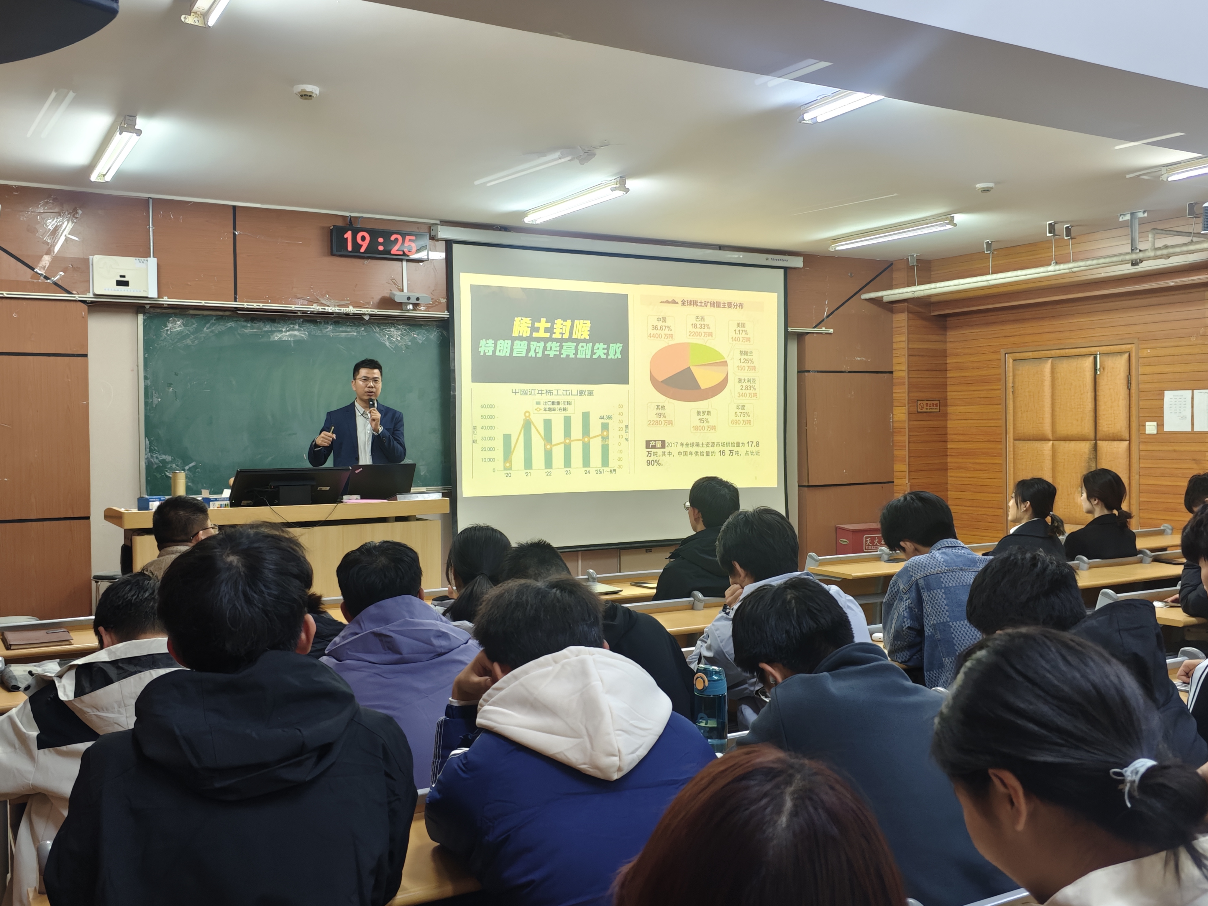 矿加242班沈小川以“行知世界-矿业工程学生赴塞尔维亚紫金矿业实习心得分享”为主题,从当地矿山工艺、人文风情讲到特色美食,以轻松幽默的语言描述了在异国实习的点点滴滴,他重点介绍了紫金矿业公司赴国外矿山工作员工的生活条件、休假制度、工资待遇和公司人文关怀等内容,极大激发了同学们对国际交流和毕业后赴国外矿山工作的热情。