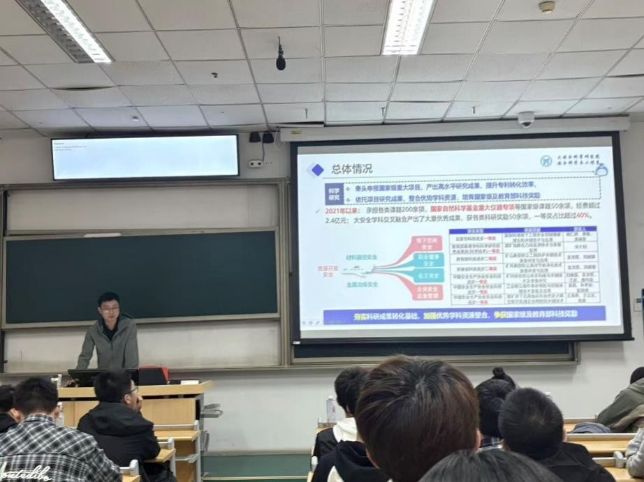 周正青对安全学科的总体情况、师资力量、科研平台、人才培养成果及未来发展进行了详细系统讲解。他介绍了安全学科师资团队依托多个国家级与省部级科研平台,承担了众多重大科研任务,产出了一系列具有重要影响力的创新成果。在人才培养方面,学生不仅在国内外各类竞赛中屡获佳绩,其深造与就业质量也持续攀升,呈现出良好的发展态势。
