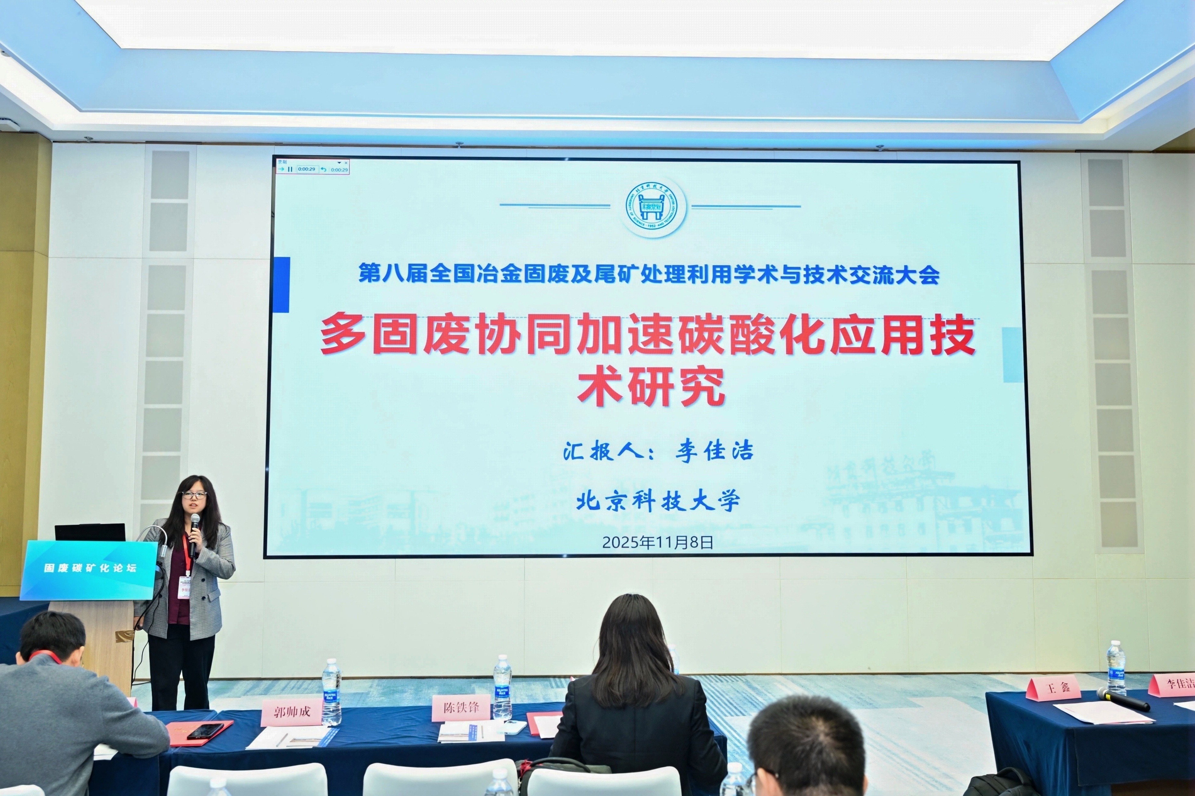 在固废碳矿化论坛上,李佳洁受邀做了题为《多固废协同加速碳酸化应用技术研究》的报告。针对我国钢铁CO2排放总量大的问题,提出了利用钢渣等钙镁基固废做CO2矿化原料制备建材,将CO2矿化存储转变为CO2矿化利用促进产业化应用。团队深耕8年,探究多固废激发钢渣碳化活性,最终总结出一套切实可行的固废固碳高值资源化利用思路。针对烟气排放浓度低且排放浓度差异大的问题,创新性开发了超低浓度CO2吸收-矿化一体化新工艺、技术和装备。针对渣体系解析难度大,整体碳酸化速率难以调控的问题,突破了基于多固废协同的各相各微观结构精准解析的复杂体系碳化固结强化技术。针对钢渣制品体积稳定性差问题,开发了符合钢渣特点碳酸化利用途径,包括钢渣碳化免烧砖、护坡石、纤维薄板、文创用品等。该技术成功在河钢唐钢进行了千吨级碳矿化中试,获得了第二届全国博士后创新创业大赛银奖,并积极开展了面向公众的科普工作。