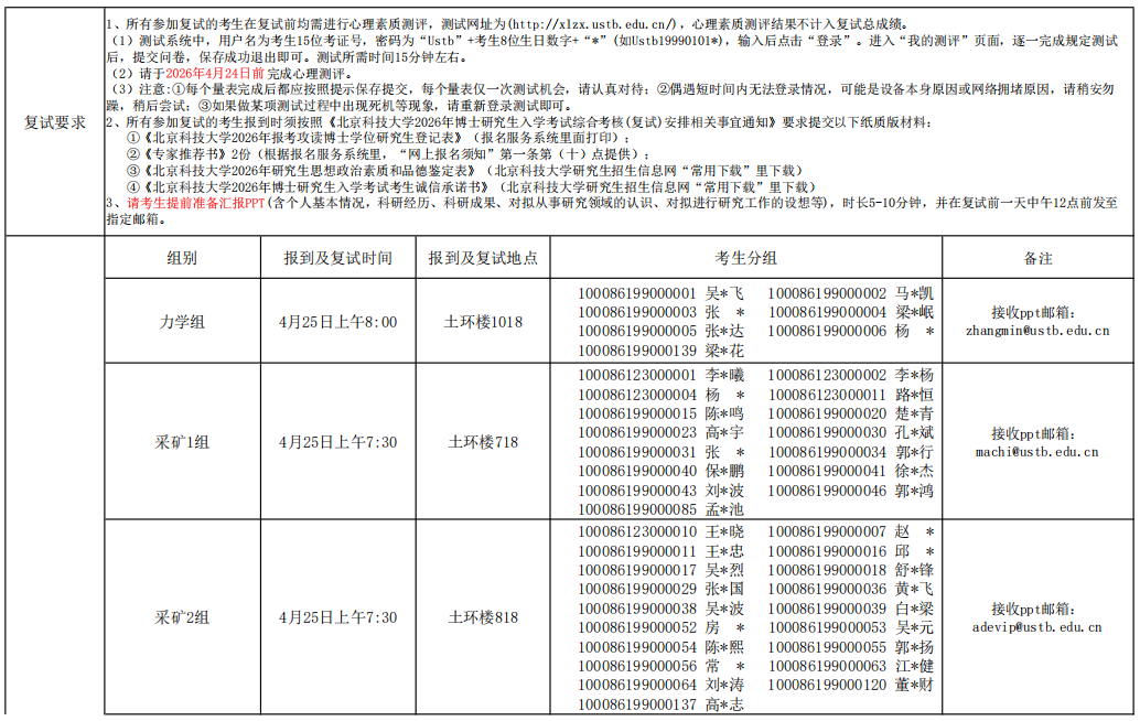 北京科技大学资源与安全工程学院2026年博士研究生入学考试综合考核(复试)安排