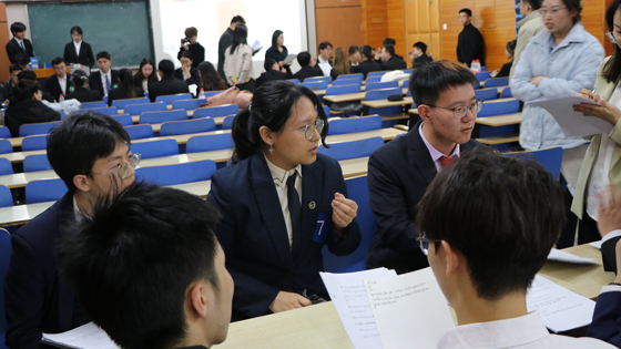 随后,第一环节比赛正式开始,参赛选手分为四组进行无领导小组讨论。比赛一开始,选手们就纷纷进入状态,积极阐述各自观点,踊跃发言并与队友讨论辩驳直至获得统一的结论。本环节结束后,12位选手成功晋级下一环节。