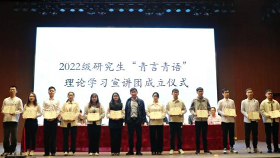 党委书记耿倩男老师宣读关于成立2022级研究生“青言青语”理论学习宣讲团的决定,副院长宋大钊教授为宣讲团成员颁发聘书。