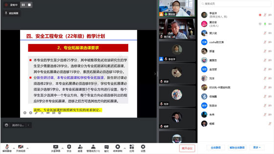 黄志安首先对各位专家的线上指导表示欢迎与感谢。随后,由副院长刘洋从学校和学院层面介绍了本次培养方案修订的背景和基本情况,黄志安则从安全工程专业的角度,详细介绍了本次培养方案的培养目标、毕业要求、教学计划和专业说明,并对教学计划的新要求进行了详细说明。