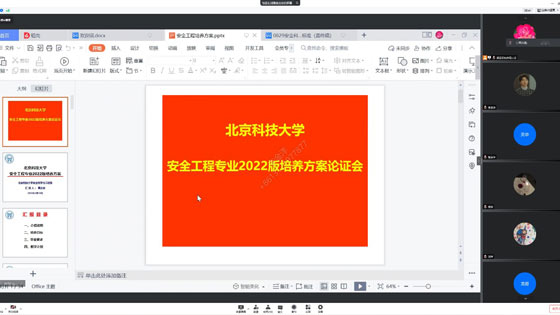 2022年5月11日下午,安全科学与工程系线上召开了安全工程2022版本科生培养方案的专家论证会,煤炭科学技术研究总院樊少武教授、中国矿大(北京)应急管理与安全工程学院副院长佟瑞鹏教授、中国职业安全健康协会陈文涛副秘书长、中国铁道科学研究院郭湛教授、北京城市系统工程研究中心主任朱伟教授、中国安全生产科学研究院时训先教授、欧派家居股份集团公司安全总监杨辉作为评审专家参与会议,大安全研究院常务副院长金龙哲教授、副院长刘洋教授、安全系主任张英华教授、大安全研究院副院长兼安全系书记黄国忠教授、安全系教学主任黄志安教授出席会议。会议由黄志安老师主持。