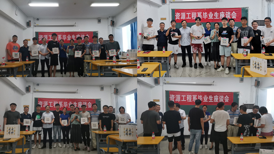 各位老师向学生们赠送资源工程系为毕业生准备的精美毕业纪念品,学生们也向老师们赠送礼物。