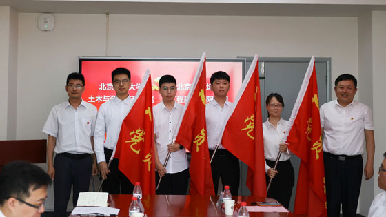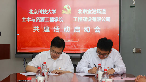 为实现党建引领加快转型升级,以党建为媒深化多方合作,以党建联建凝聚团队力量,北京金港场道工程建设有限公司与北京科技大学土木与资源工程学院共同推出了“红色联盟”党建品牌。公司董事长、总经理、党总支书记王路波和学院党委书记苗胜军共同为“红色联盟”品牌活动揭牌,签署共建合作协议。公司总工程师、第二党支部书记杨扬和土木与资源工程学院副院长刘洋,共同为公司党员代表及学生党员代表授予党员先锋队旗帜。