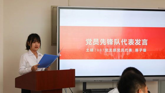 最后,公司党员代表宋宇发起“亮身份 做表率 当先锋”倡议,表明了作为一名党员为群众服务、争当先锋的决心和信心。土硕2007党支部陈子璇作为党员先锋队代表发言,呼吁各位党员从我党的百年奋斗历程中汲取卓越品质,作为研究生党员,要锤炼科研能力,为我国科技事业注入新鲜血液;作为奋斗在祖国建设第一线的工程人员,就该扎根基层,为中国基建事业发光发热,让青春在党和人民最需要的地方绽放绚丽之花。