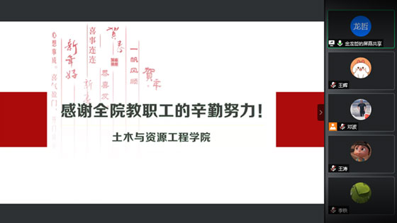 2021年1月12日下午,土木与资源工程学院线上召开了第七届第一次全体教职工大会,共有185人线上参加了会议。校工会常务副主席贾水库、学院班子成员及学院教职工参加了会议,会议由学院党委书记纪洪广主持。