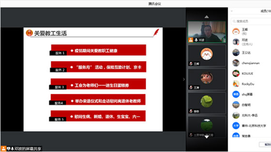 接着副院长邓波就2020年学院的工会工作及学院的财务收支情况进行了汇报。年内顺利召开了学院第七届教职工代表大会暨工会换届大会,保障了民主渠道畅通,既贯彻落实学校学院的政策制度,又维护保障广大教职工的权益。坚持财务公开,开展教职工喜闻乐见的活动得到了教职工的广泛认可。同时,围绕疫情期间关爱教职工健康、“服务月”活动,举办荣退仪式和走访慰问离退休老教师等具体服务项目进行汇报,体现了全心全意为广大教职工服务的宗旨。