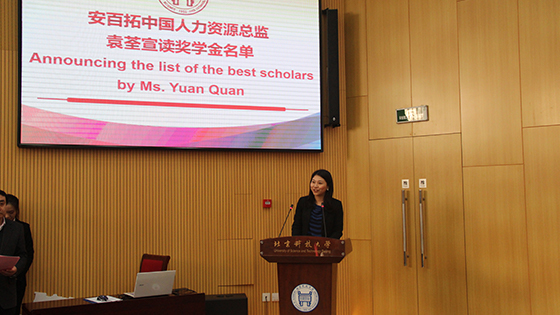 安百拓贸易有限公司人力资源部经理袁荃公布了获得“安百拓”采矿奖学金的51名同学名单,并向获得奖学金的同学表示祝贺。