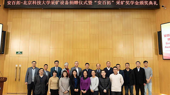 2019年12月18日,安百拓-北京科技大学采矿设备捐赠仪式暨“安百拓”采矿奖学金颁奖典礼在学术报告厅举行,北京科技大学副校长何民庆,安百拓中国区总裁Brian Doffing、传播副总裁Sofie Gielen;安百拓(南京)建筑矿山设备有限公司人力资源部经理孙小勇;安百拓贸易有限公司人力资源部经理袁荃,高级产品经理阚世喆;校友会、基金会办公室副主任杨志国;土木与资源工程学院院长金龙哲,党委书记纪洪广,副院长宋卫东、尹升华,党委副书记邓波;高等工程师学院副院长贺东风;资源系教师及17-19级本科生出席此次活动,活动由资源系主任金爱兵主持。
