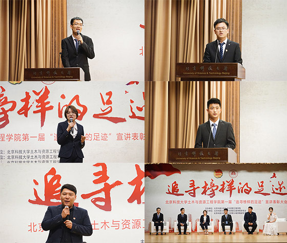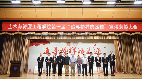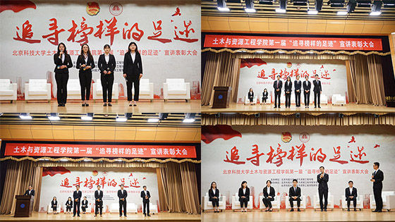 为进一步落实学校“一院一品”育人品牌项目培育工作,发挥学生朋辈榜样的示范引领作用,充实完善我院新生教育系列活动,2019年5月8日,北京科技大学土木与资源工程学院第一届“追寻榜样的足迹”宣讲表彰大会在教职工礼堂圆满举办。学生工作部、武装部副部长王小宁,学生创新创业中心副主任王丽红,校团委副书记于宝库,土木与资源工程学院党委书记纪洪广,副院长乔兰、李长洪、耿倩男,党委副书记、副院长邓波以及各系所主要负责人出席活动。