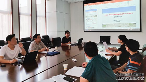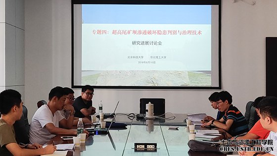 2018年8月10日上午,由北京科技大学承担的“十三五”国家重点研发计划课题 “超高大型尾矿坝隐患治理技术与装备”专题四“超高尾矿坝渗透破坏隐患判别与治理技术”进展讨论会在华北理工大学矿业学院召开。专题负责人、北京科技大学土木与资源工程学院李长洪教授与华北理工大学矿业工程学院张云鹏教授、陈超教授、马亚杰教授、于江涛老师以及两校部分博士、硕士参加了会议。