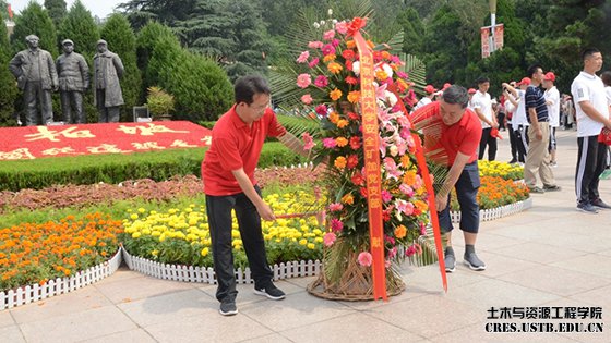 参观结束后,在西柏坡纪念馆前,全体党员老师首先奏唱了中国人民共和国国歌,随后面对党旗,举起右拳跟随李长洪副院长一起重温了入党誓词,誓词虽短,但饱含承诺与担当。随后全体党员老师向“赶考”伟人铜像敬献了花篮和三鞠躬,矿物加工工程系党支部书记李正要老师和安全工程系党支部书记黄国忠老师亲手整理花篮。