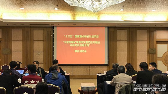 2017年12月3日上午,由北京科技大学承担的“十三五”国家重点研发计划“大型高尾矿库溃坝灾害防控关键技术研究及应用示范”项目所属课题九“超高大型尾矿坝隐患治理技术与装备”启动会暨课题讨论会在北京日航酒店新世纪酒店重庆厅召开。中国工程院院士蔡美峰、中国科学院武汉岩土力学研究所研究院、项目负责人杨春和等专家应邀出席,课题牵头单位北京科技大学、课题参与单位北京矿冶研究总院、中国计量大学、重庆大学、华北理工大学、河海大学等6家单位的30余名代表参加了会议。