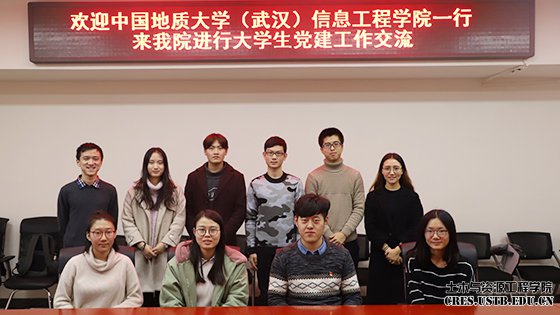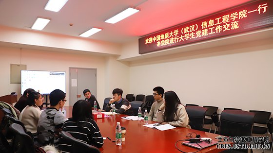 随后,我院学生会主席牟欣丽介绍了我院学生组织建设,对各部门运作流程和相互协作的工作模式进行了详细阐述。土本151党支部骨干张卓勋结合支部当前党建模式和党建实际工作内容,就党建话题分模块进行了系统的介绍。党员代表刘泽京介绍了我院代表学校参加北京市高校红色“1+1”示范活动荣获北京市一等奖的相关内容,就基层支部共建活动进行了经验交流。通过我院相关人员展示,中国地质大学(武汉)信息工程学院一行对学生党建工作和组织建设有了新的启发。