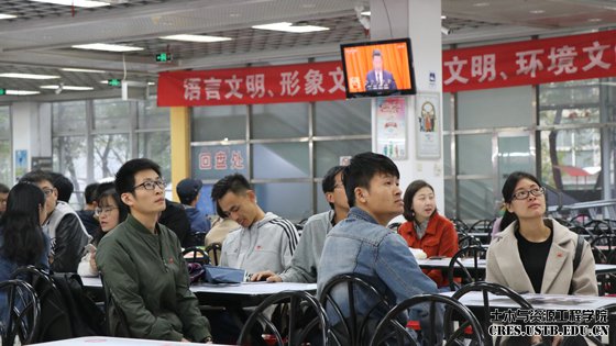 本次学习共分为三个会场,充分利用网络、电视直播等形式,利用会议室、机房、学生食堂等场地,认真聆听习近平总书记作的专题报告。