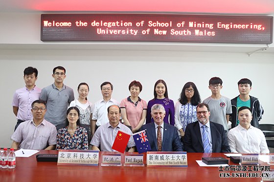 6月22日,澳大利亚新南威尔士大学矿业工程学院院长Paul Hagan、Michael Hitch教授、张呈国博士一行来我院访问交流。国际合作与交流处处长郭侃俊、土木与资源工程学院党委书记纪洪广、副院长耿倩男、资源工程系宋卫东、李翠平、青年教师陈昕、李佳杰、学生辅导员李钊源、田兴华、牛小萌、以及学生代表黄金宝、刘彪等与会参加了交流,见证了我院与新南威尔士大学矿业工程学院采矿工程本科生2+2项目协议签署的重要时刻。