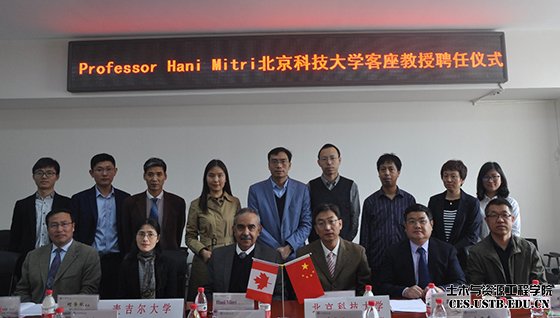 4月5日上午,北京科技大学客座教授聘任仪式在土木楼214会议室隆重举行,Hani Mitri教授受聘为我校客座教授。Hani Mitri教授目前担任麦吉尔大学矿业工程系主任、学科负责人及学术带头人,长期致力于矿井设计、矿山岩石力学和深井井巷工程、深井岩爆机理与防治等方面的研究。出席此次授聘仪式的有北科大国际合作与交流处处长郭侃俊教授,何学秋教授,北科大土资学院书记金龙哲教授,土资学院副院长耿倩男教授、李长洪教授,北科大采矿工程系主任宋卫东教授,安全工程系主任张英华教授及采矿工程系、安全工程系部分教师。