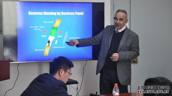 4月7日下午,加拿大麦吉尔大学Hani Mitri教授应我院安全科学与工程系何学秋教授邀请,在土环楼214会议室做了题为 “Destress Blasting – From Theory to Practice” 的学术报告,报告会由安全科学与工程系宋大钊副教授主持,中国矿业大大学王恩元教授,大同煤矿集团有限责任公司同大科技研究院刘锦荣所长,以及我院安全科学与工程系龚敏教授、李铁教授,资源工程系姜福兴教授、璩世杰教授等师生到场聆听报告并参加了随后的研讨交流会。