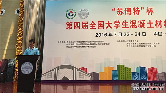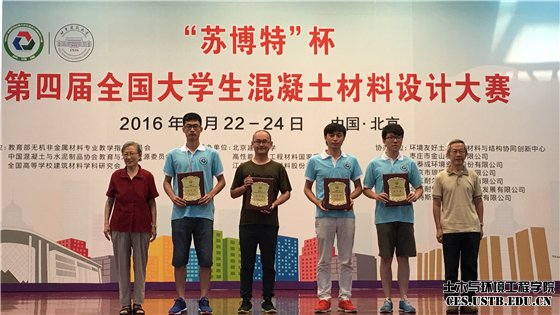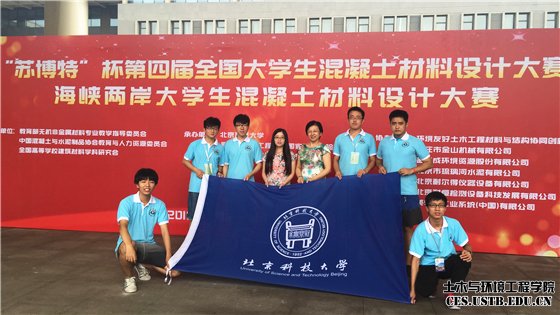 7月22日-24日,“苏博特”杯第四届全国大学生混凝土材料设计大赛在北京建筑大学隆重举行,全国73所高校的材料、土木和交通领域的375名学生、175名参赛指导教师组成的125支队伍参赛。北京科技大学两支代表队分别荣获特等奖第一名和三等奖,一人获个人特等奖,两位教师获大赛优秀指导教师,学校获优秀组织奖。