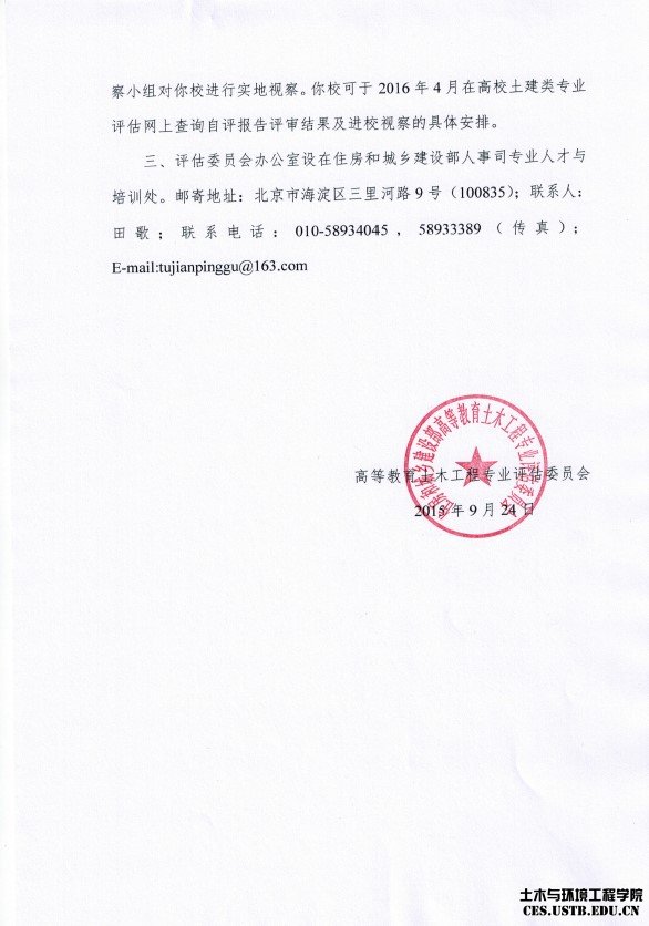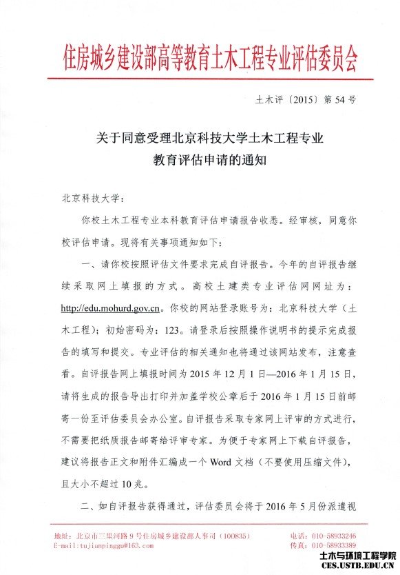 2015年9月24日,住房城乡建设部高等教育土木工程专业评估委员会对“同意受理北京科技大学土木工程专业教育评估申请”下发通知。通知文件如下: