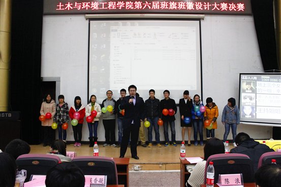 六年康庄,方兴未艾,光荣绽放,亮剑今朝。土木与环境工程学院第六届班旗班徽大赛决赛于11月30日在学术报告厅隆重举行,本次决赛集结了初赛的前六名班级,由土环学院团委书记张毅老师13级辅导员:尹传举、阮竹恩、卢小刚、边路,前任学生会主席郝丽婷学姐,新闻宣传中心吴晓东学长,校团委宣传部副部长张旸学长及学生会主席组成的评委团参与各个班级的评分。