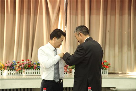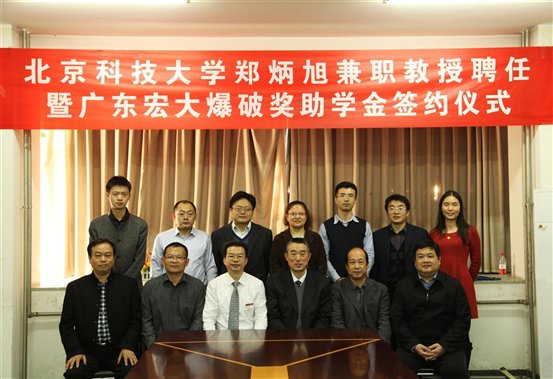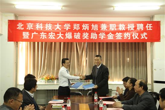 2013年11月18日下午,北京科技大学郑炳旭兼职教授聘任仪式暨广东宏大爆破奖助学金签约仪式在土环楼314会议室隆重举行。北京科技大学研究生院常务副院长、土木与环境工程学院院长,校友会、教育发展基金会副主任吕朝伟,土木与环境工程学院副院长、、、,广东宏大爆破股份有限公司董事长郑炳旭,湖南涟邵建工集团总经理李萍丰等宏大公司的领导参加了本次仪式。仪式由土木与工程学院党委副书记、副院长主持。聘任仪式上,党委副书记较为详细地介绍了郑炳旭教授的学术成就。院长为郑炳旭教授颁发了聘任书,并为郑教授佩戴了北京科技大学校徽。