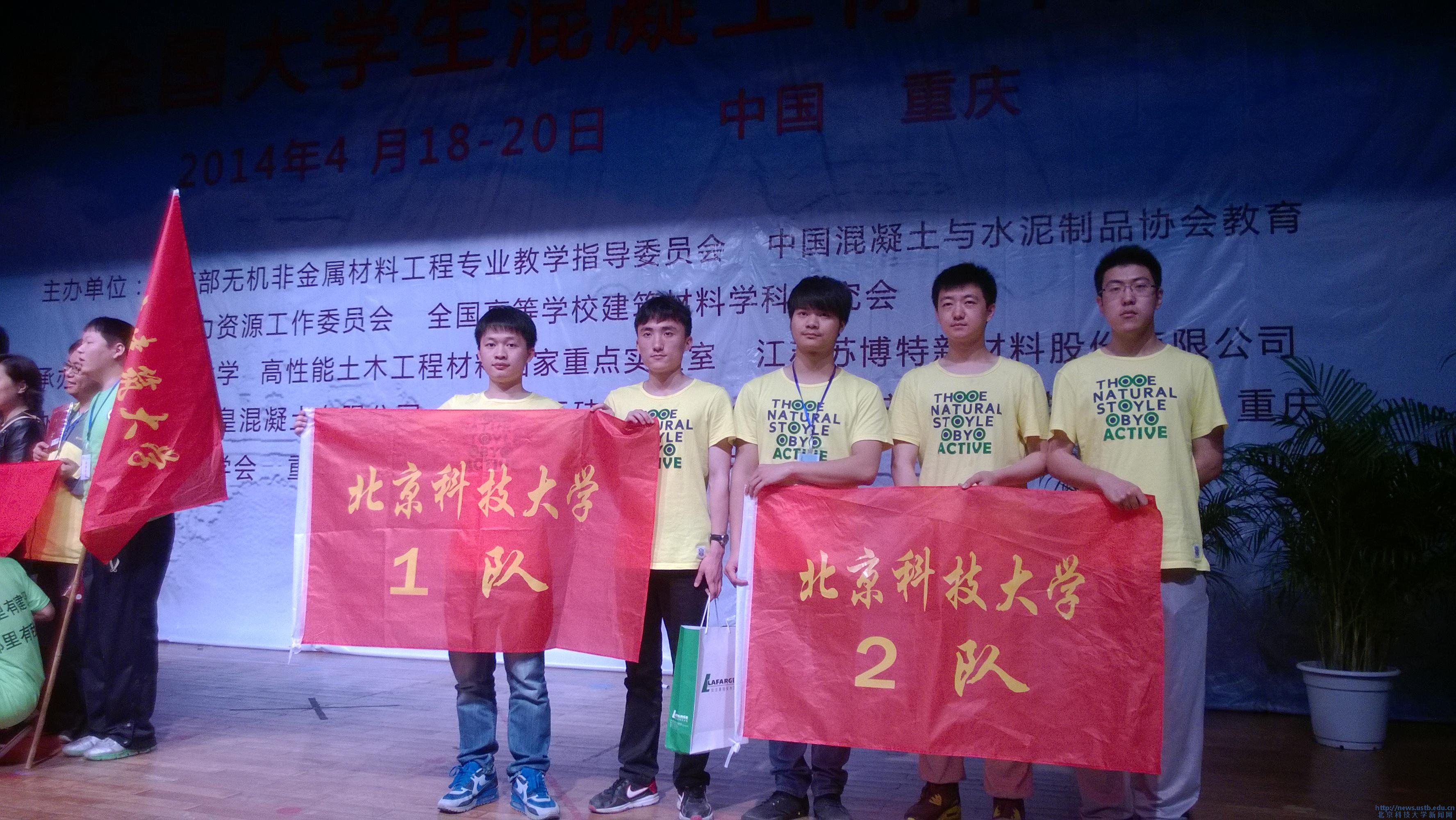 “苏博特”杯第三届全国大学生混凝土材料设计大赛4月20日在重庆大学落下帷幕。来自同济大学、东南大学、北京科技大学、重庆大学、中南大学、哈尔滨工业大学等61所高校的材料、土木和交通领域109支队伍参加比赛。我校土木工程专业2011级学生苏晓波、陈龙根、章同学组成的参赛队夺得特等奖;胡超、丁明涛、陈炫同学组成的参赛队也以优异成绩获得二等奖。教授获得大赛优秀指导教师。