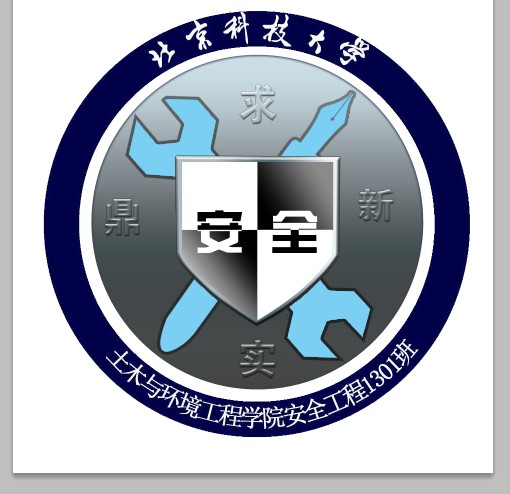 展现在我们眼前的是大安全1301班的班徽,整体上看,班徽由灰色、蓝色和黑色的冷色调构成,体现了一种严谨肃穆,而这与我们安全工程学科所具有的本质是密不可分的。在他中央是一面安全盾盾牌,盾牌之上铭刻“安全”两字,黑白交错,展示了我们这个学科致力于保护人身安全公共财产的本质。盾牌后交叉着青色的钢笔与扳手,体现着我们永远铭记并落实理论与实践相结合的信念。再其后,是一块刻着“求是鼎新”的灰色钢板,牢牢地顶在安全盾和“理实交叉”后面,体现了北京科技大学六十余年来所传承的“求实鼎新”的精神永远是我们前进的最强后盾,使我们时刻感受着学校的务实与创新的灵魂。外圈以北京科技大学特有的深蓝作底,镂空的文字更形象地说明了我们安全一班永远是北京科技大学土木与环境工程学院的一份子,一股不可或缺的力量!