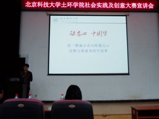 2013年4月13日晚七点,由北京科技大学土木与环境工程学院实践部主办以“梦想的力量”为主题的社会实践及创意大赛宣讲会第一场在学术报告厅拉开帷幕。