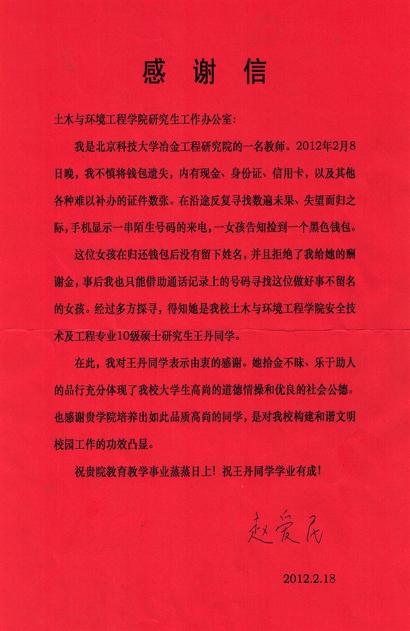 2012年2月21日下午,我们收到了我校冶金工程研究院赵爱民老师的感谢信(如前文),感谢我院安全技术及工程专业硕10级王丹同学拾金不昧、归还钱包、谢绝酬谢的行为,王丹同学拾金不昧,乐于助人的品行充分体现了她良好的个人品质和社会公德,是我们全院师生应该学习的榜样。