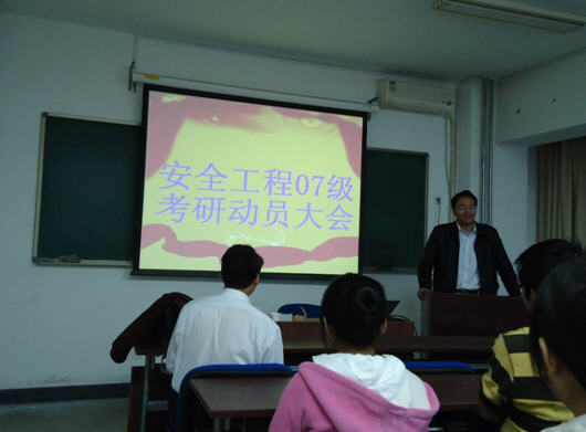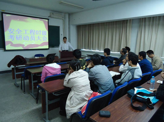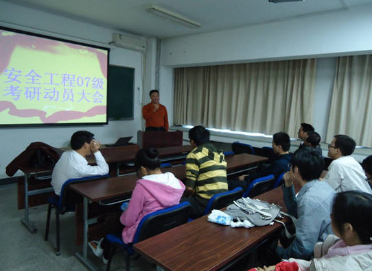 适逢2011年考研正式报名之际,为了帮助同学们正确地报考适合自己的专业,鼓励报考的同学以饱满的精神状态参加考试复习中去,10月15日上午,在土木与环境工程学院1018教室召开了安全工程07级考研动员会。主任教授,书记老师以安全工程071,072班的班主任老师、刘建老师出席了动员会。