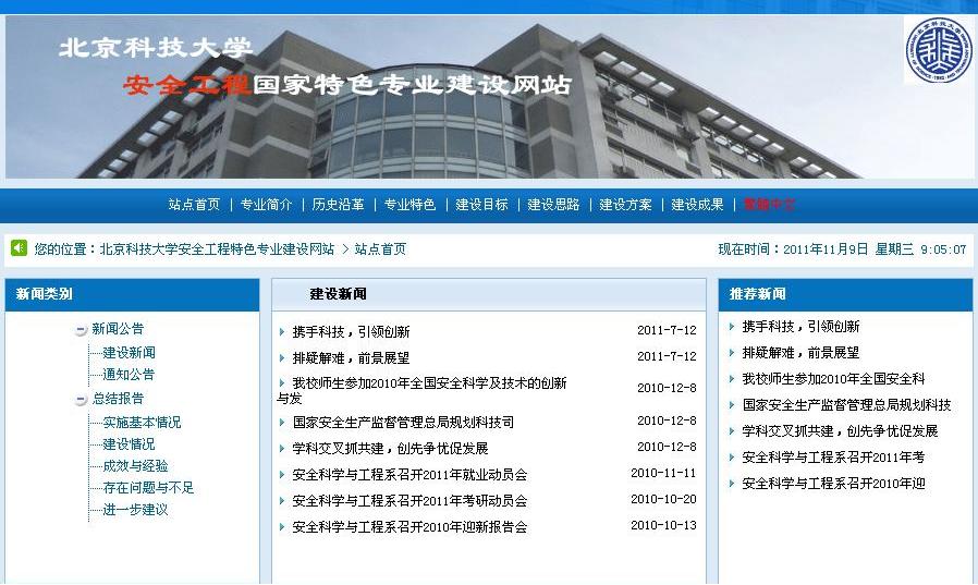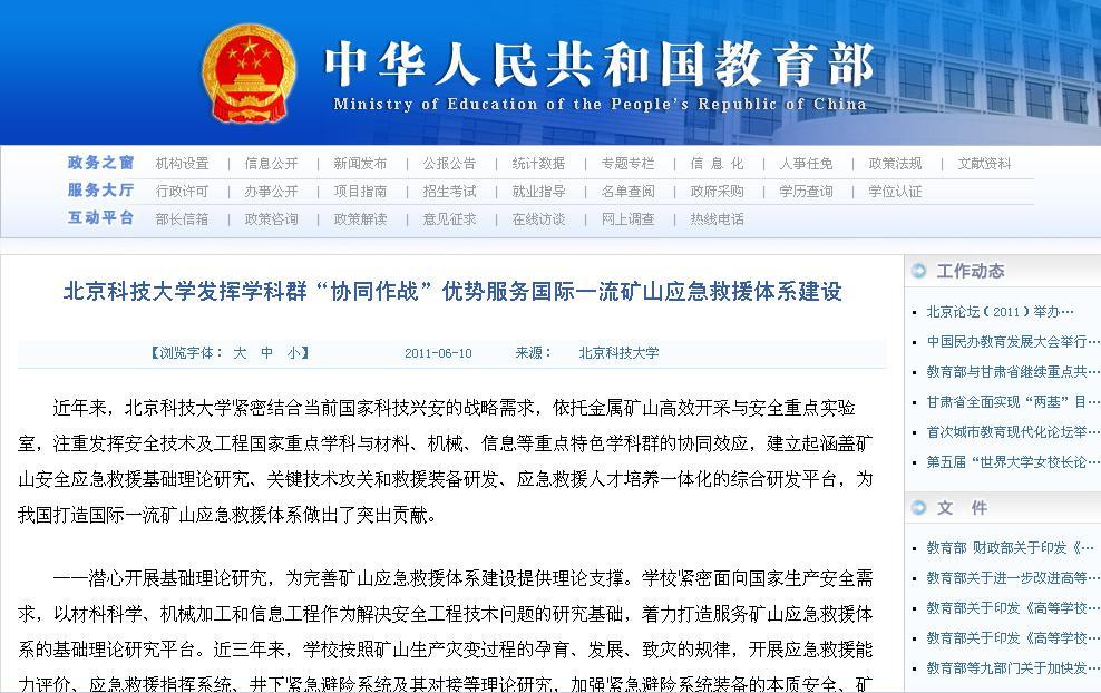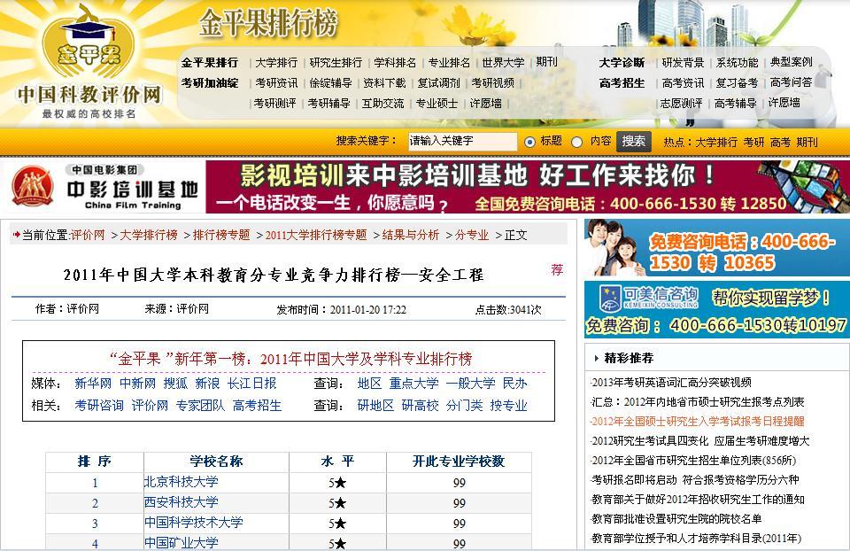 在金平果2011-2012年中国大学本科教育分专业竞争力排行榜上,我校安全工程排名全国第一。从该排行榜近三年的排名情况看,我校安全工程的排名逐年提高,2009年排名第5,2010年排名第2,今年排名第1。此次排名说明我校安全工程本科教育在近几年取得了长足的进步,安全07级52名毕业学生中,有10名学生出国深造,一名保送中科院,1名保送浙江大学,上研率60%,就业率96.15%;安全08级目前已有2名同学保送清华大学,成绩突出。教育部网站上报道了该专业采取多项举措,发挥学科群“协同作战”优势服务国际一流矿山应急救援体系建设的近况(网址:),同时学科点建设了国家级特色专业网站(网址:safets.ustb.edu.cn),对专业建设进行了跟踪报道。