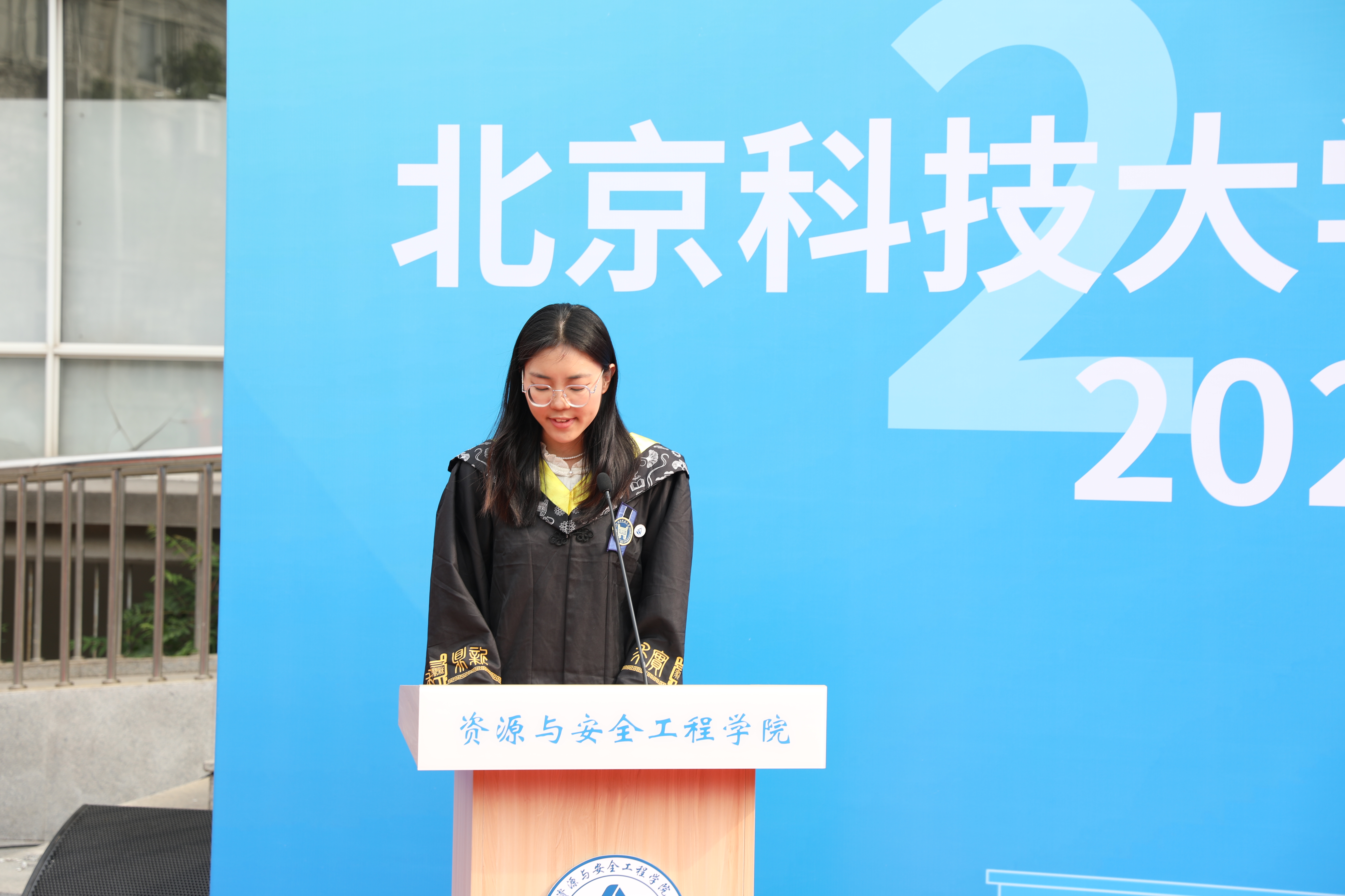 北京科技大学第十九届校长奖章获得者、采矿工程专业2025届毕业生赵丽姗代表本科毕业生发言。她在发言中深情回顾了四年北科大时光,从初入校园的青涩到如今满载收获的蜕变,衷心感谢学院的培养、老师的教诲、父母的支持和同窗的陪伴,以及军训、班会、实习等等带来的成长。在学院的培养下,同学们都有了不同的未来选择,或潜心科研、或奔赴基层、或深入矿山,都体现了将青春融入国家需要、守护矿业安全的志向,倡议大家无论身在何方,永葆求知之心,在各行各业共同谱写“钢铁脊梁”的新篇章。