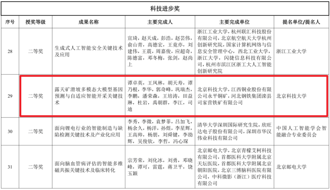 近日,我国人工智能领域最高奖项之一的“吴文俊人工智能科学技术奖”评选结果揭晓。北京科技大学资源与安全工程学院谭卓英教授团队牵头的“露天矿滑坡多模态大模型基因预测与自适应智能开采关键技术”项目,经激烈角逐,凭借人工智能在矿业领域的技术突破和应用效益,荣获吴文俊人工智能科技进步奖二等奖。