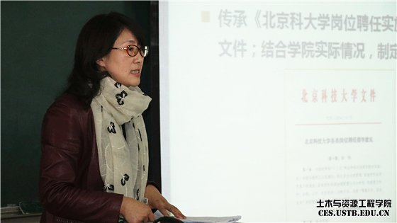 王媛院长介绍了学院岗位聘任的指导思想和组织程序,并从岗位竞聘条件、岗位职责以及考核办法等方面,对《土木与资源工程学院聘期考核实施细则(讨论稿)》和《土木与资源工程学院岗位聘任实施办法(讨论稿)》进行了详细解读。她希望以此次聘期考核和岗位聘任为契机,贯彻落实“普惠全员、鼓励拔尖”的总体思路和“尊重历史、面向未来”的工作方针,营造既和谐舒心又积极奋进的工作环境。在王媛的主持下,参会教职工审议并以举手表决的形式一致通过了《土木与资源工程学院聘期考核实施细则》和《土木与资源工程学院岗位聘任实施办法》。